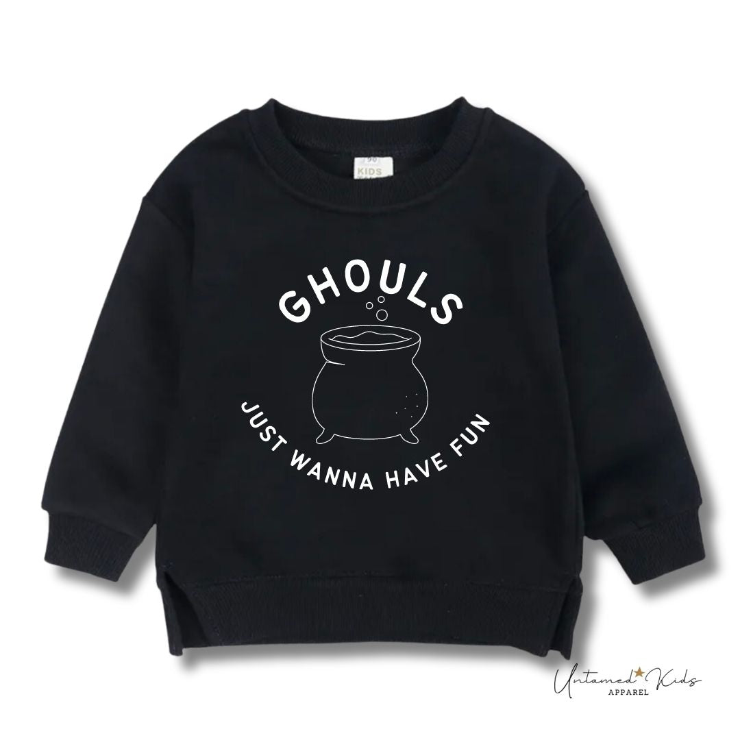 Welcome to our spook-tacular online emporium, where Halloween fashion takes center stage! Get ready to embrace the eerie excitement and festive fun with our latest creation – the "Ghouls Just Want to Have Fun" Halloween Girls Crewneck Sweatshirt.
